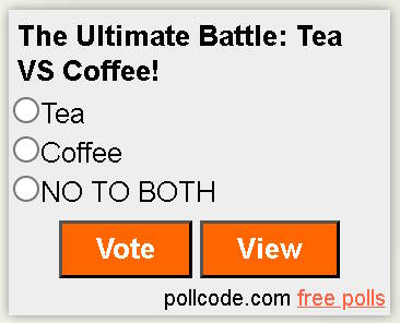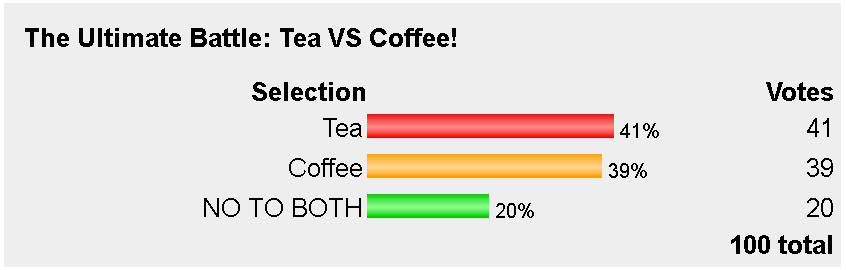Hmmm, so 41% voted "Tea" (41 votes), 39% voted "Coffee" (39 votes) and 20% voted "NO TO BOTH!" (20 votes).