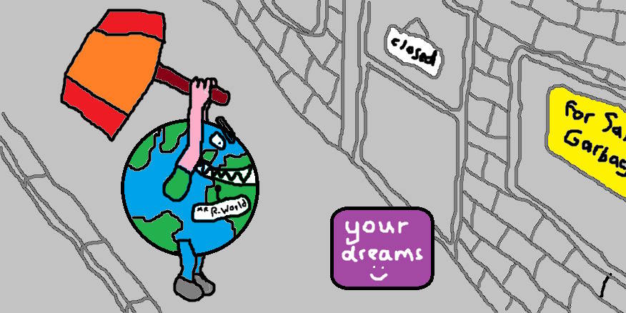 It represents the crushed dreams of so many, the store is closed and that's sad. The shop just sells garbage anyway. And everything in the background is all grey.